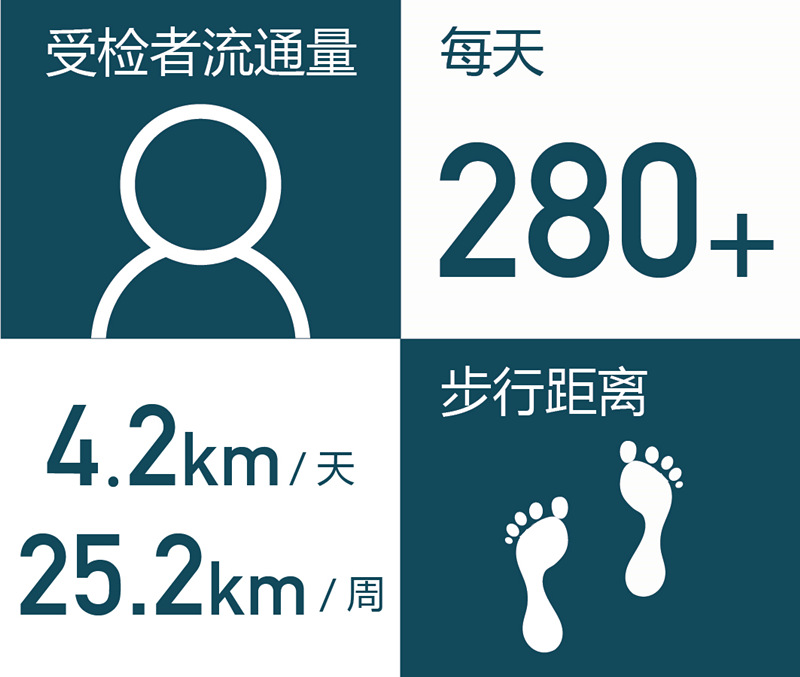 这也意味着他们必须在工作中面临一场无止境的“步行马拉松”:张医生计算过,从体检科DR机房的操作室电脑桌走到拍摄体检胸片所需的胸片架,一共要走9-10个大跨步。也就是说,他每进行一次胸片检查就需要来回步行近14米。一个上午做300次检查就意味着要走4.2公里的路程,一周6天的工作就相当于走了大半个马拉松的距离……